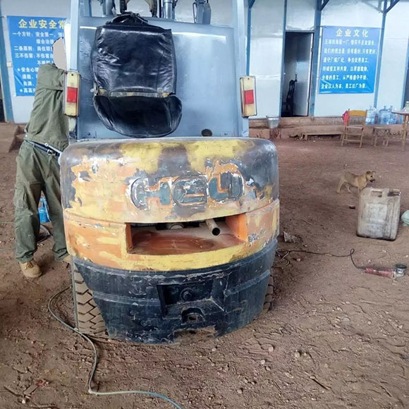 這臺翻新的叉車,可以肯定的說是假冒偽劣叉車,從圖中我們可以看到配重打磨過的痕跡,黑乎乎的,似乎已經(jīng)準(zhǔn)備完工。