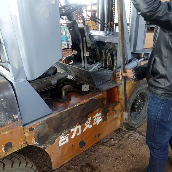 5、不以標(biāo)準(zhǔn)叉車來比對參數(shù):如輪胎型號、門架結(jié)構(gòu)、配重(實鐵的用錘子敲的時候聲音“丁丁”;水泥的只是鐵皮包圍,中間是水泥,鐵錘敲的時候聲音“咚咚”)和車架不能分離。