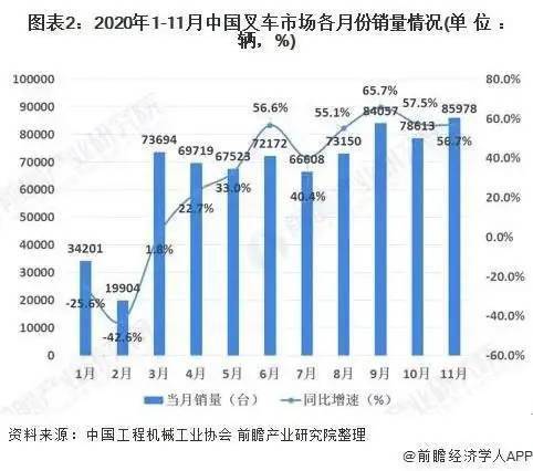 2020年受益于國內(nèi)新冠疫情得到迅速控制,國內(nèi)制造業(yè)、物流業(yè)的快速恢復(fù),叉車市場需求快速增長。2020年1-11月份的累計銷量達到72.56萬輛,與2019年同期相比增長30.3%。