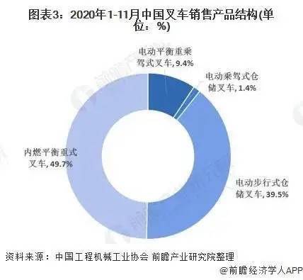叉車主要分為四類,包括內(nèi)燃平衡重式叉車、電動平衡重叉車、電動乘駕式倉儲叉車、電動步行式倉儲叉車,分別對應(yīng)歐美分類標(biāo)準(zhǔn)的IV/V、I、II、III類叉車。從2020年1-11月份的銷售結(jié)構(gòu)來看,內(nèi)燃平衡重式叉車和電動步行式倉儲叉車占比最高,分別為49.7%和39.5%。