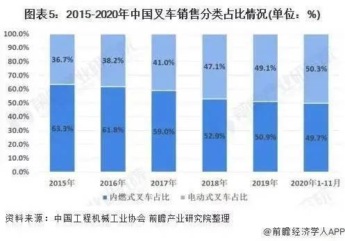 2020年1-11月份的累計銷量達到72.56萬輛,與2019年同期相比增長30.3%,其中電動式叉車銷量占比達到50.3%,比2019年增長1.2個百分點,主要是受環(huán)保要求和室內(nèi)作業(yè)環(huán)境要求的驅(qū)動,電動叉車需求持續(xù)增長。